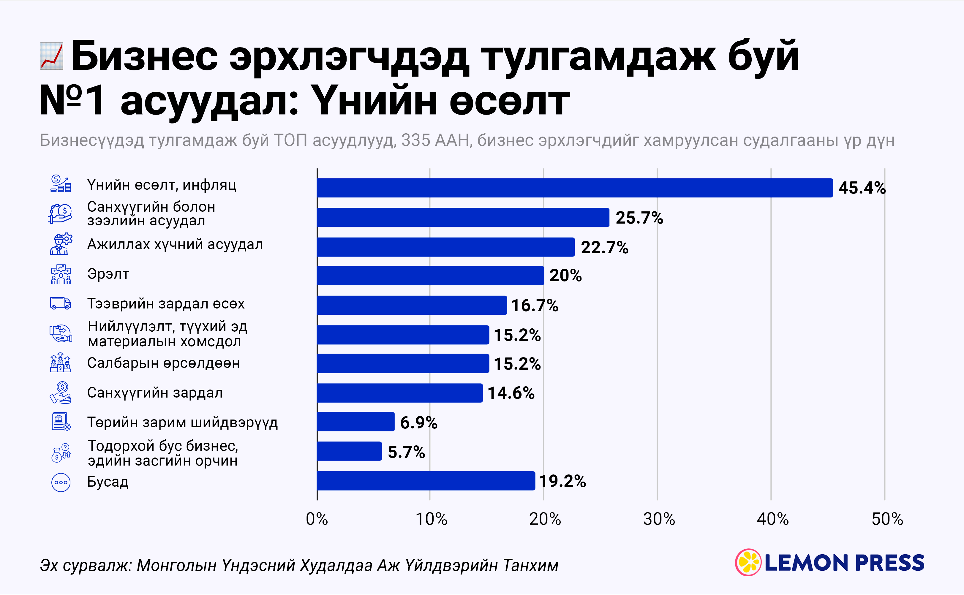 Өмнө нь (2018-2020 он) бизнес эрхлэгчид зээлийн хүүг хамгийн том саад гэж нэрлэдэг байсан бол 2025 оны эцсийн байдлаар үнийн өсөлт, инфляц (45.4%) хамгийн том "толгойны өвчин" болжээ. Энэ нь бизнес эрхлэгчдийн зардлын хяналт алдагдаж, ашигт ажиллагаа шахагдаж байгааг илтгэж байна. Инфляцын дараа орох гол хүчин зүйлс нь: