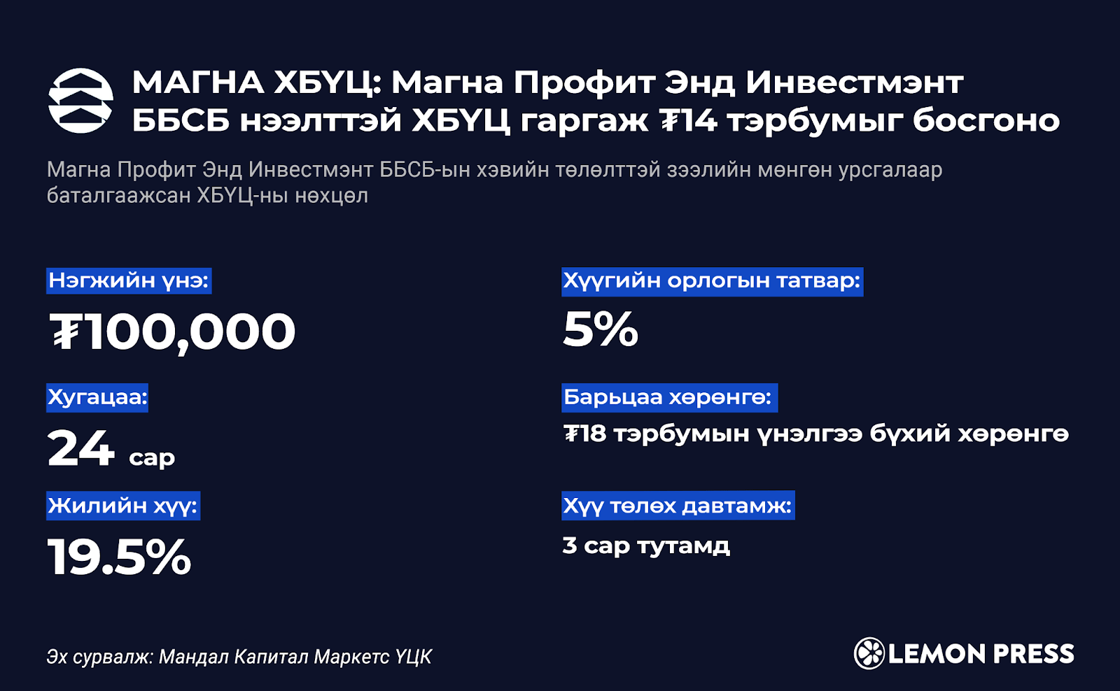 Хөрөнгө оруулагчдын анхааралд! Магна Профит Энд Инвестмэнт ББСБ ХХК-ийн үүсгэн байгуулсан Магна Актив ТЗК ХХК-ийн Мандал Капитал Маркетс ҮЦК-тай хамтран гаргаж буй ₮14 тэрбумын хөрөнгөөр баталгаажсан үнэт цаас (ХБҮЦ)-ны урьдчилсан захиалга эхэлжээ.