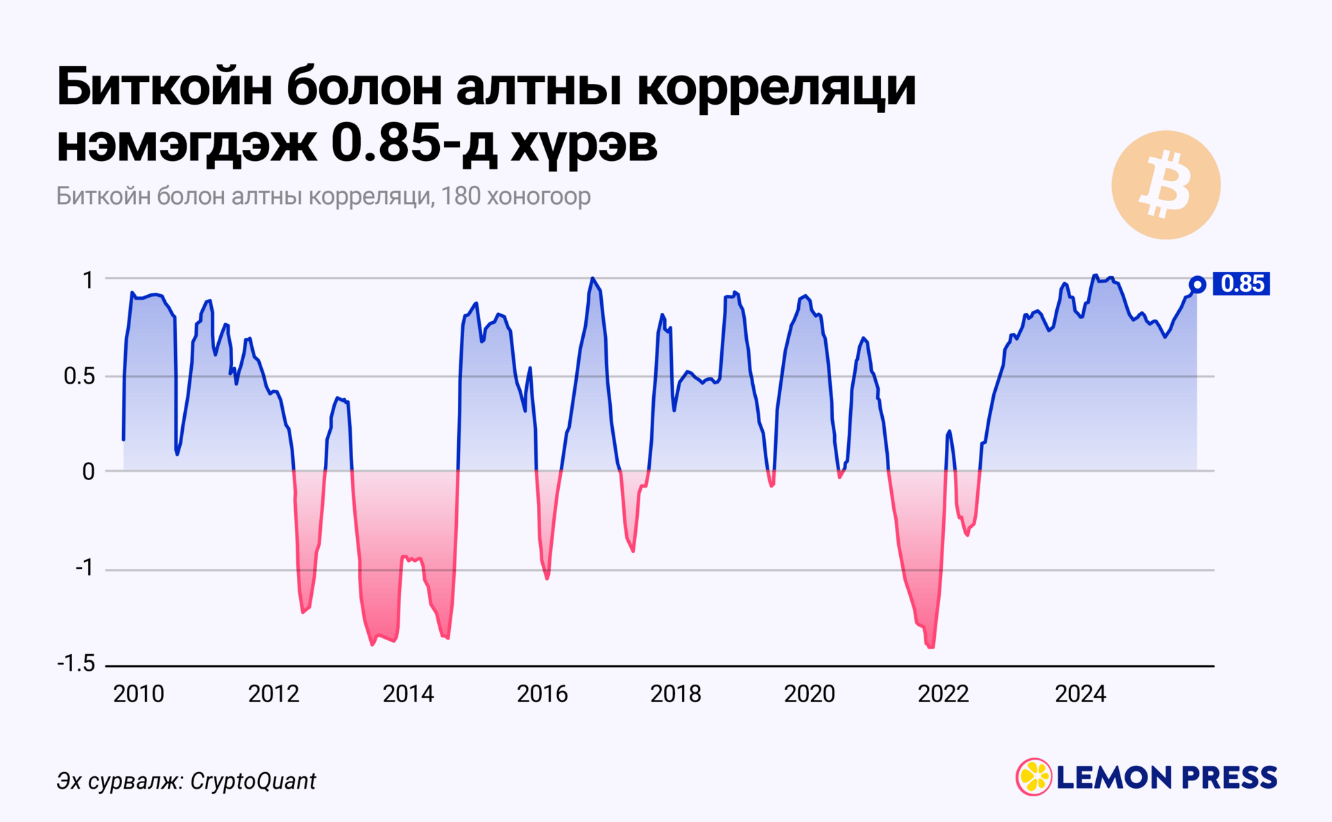 🧮 Корреляци 0.85: Криптовалютаар дагнасан CryptoQuant-н мэдээллээр 180 хоногийн $BTC болон алтны корреляци одоогийн байдлаар 0.85-ыг давсан аж. Нэг ёсондоо алтны үнэ өсөхөд $BTC-ы үнэ ч дагаад өсөх хандлагатай байгааг итгэнэ.