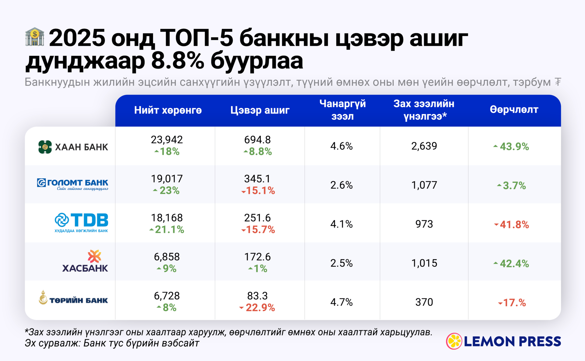 🆙 Хөрөнгө нэмэгдсээр: Нөгөөтээгүүр банкны салбарын зээлийн багц тэлсээр байгаа тул ТОП-5 банкны нийт хөрөнгийн хэмжээ дунджаар 16% өсөж нийлбэр нь ₮74.7 их наяд болжээ. Энэ нь МХБ (MSE) дээр бүртгэлтэй компаниудын нийт зах зээлийн үнэлгээнээс 5.3 дахин өндөр дүн аж.