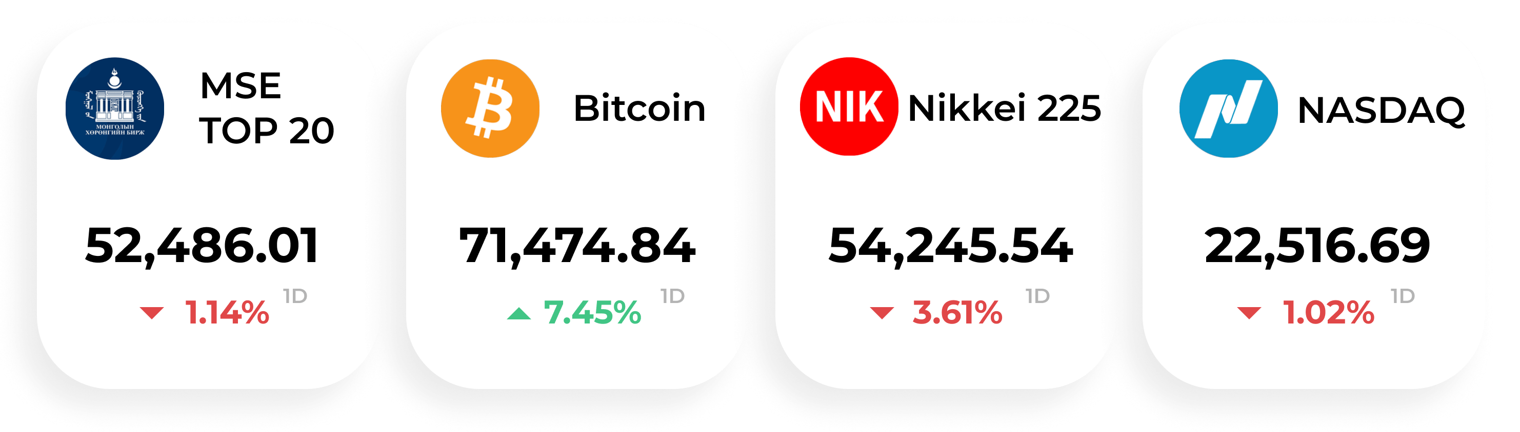 MSE: Өчигдрийн арилжаагаар Монинжбар ХК (MIB)-ийн хувьцаа 15% , Женко тур бюро ХК (JTB)-ийнх 10.7%, Крипто Үндэстэн ХК (CNF)-ийнх 9% тус тус өсөж өсөлтийн цувааг тэргүүллээ.
