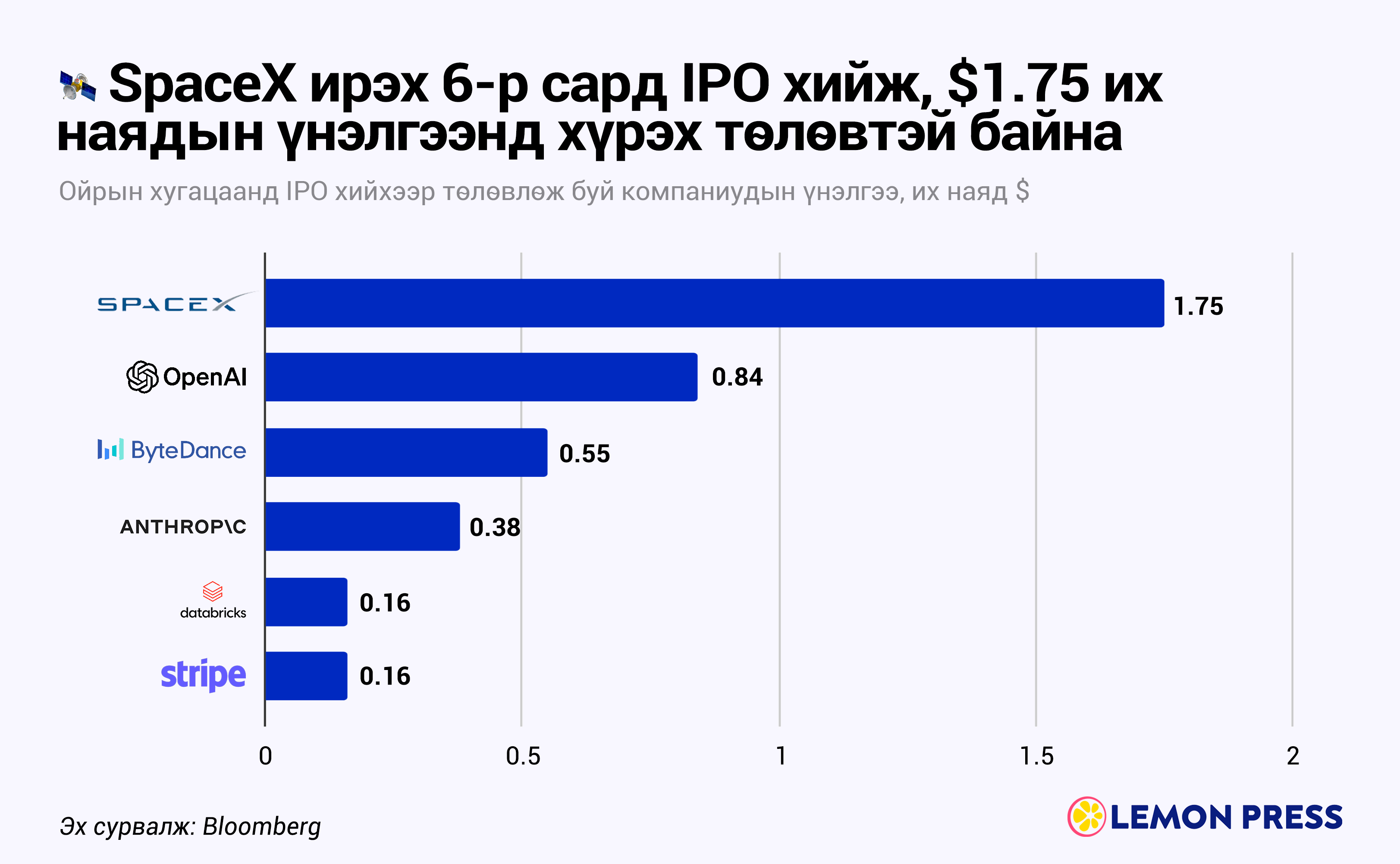 SpaceX-с гадна хэд хэдэн компанийн IPO ойрын хугацаанд хийгдэх хүлээлттэй аж. Тухайлбал, өнгөрсөн сарын сүүлээр AI-н аварга OpenAI $110 тэрбумын хөрөнгө оруулалт татсанаар үнэлгээ нь $840 тэрбумд хүрчээ. Харин тэдний гол өрсөлдөгч Anthropic Series-н үнэлгээ $380 тэрбумд хүрээд байгаа ба хамгийн сүүлд Series G шатанд $30 тэрбумыг санхүүжилт татсан аж. Түүнчлэн TikTok-г эзэмшигч ByteDance-г хөрөнгө оруулалтын General Atlantic $550 тэрбумаар үнэлээд байна.