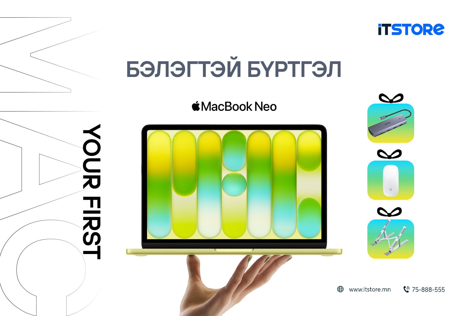 Юутай ч ITStore MacBook Neo-н Монгол дахь нээлтээ тохиолдуулан “You First Mac” урамшуулал зарлажээ. MacBook Neo-гоо худалдан аваад Magic mouse, Hub, Laptop Stand бэлгэд авч болох нь ээ. Загвар бүр урьдчилгаагүй лизинг, үнэгүй хүргэлтээр авах боломжтой гэсэн шүү.