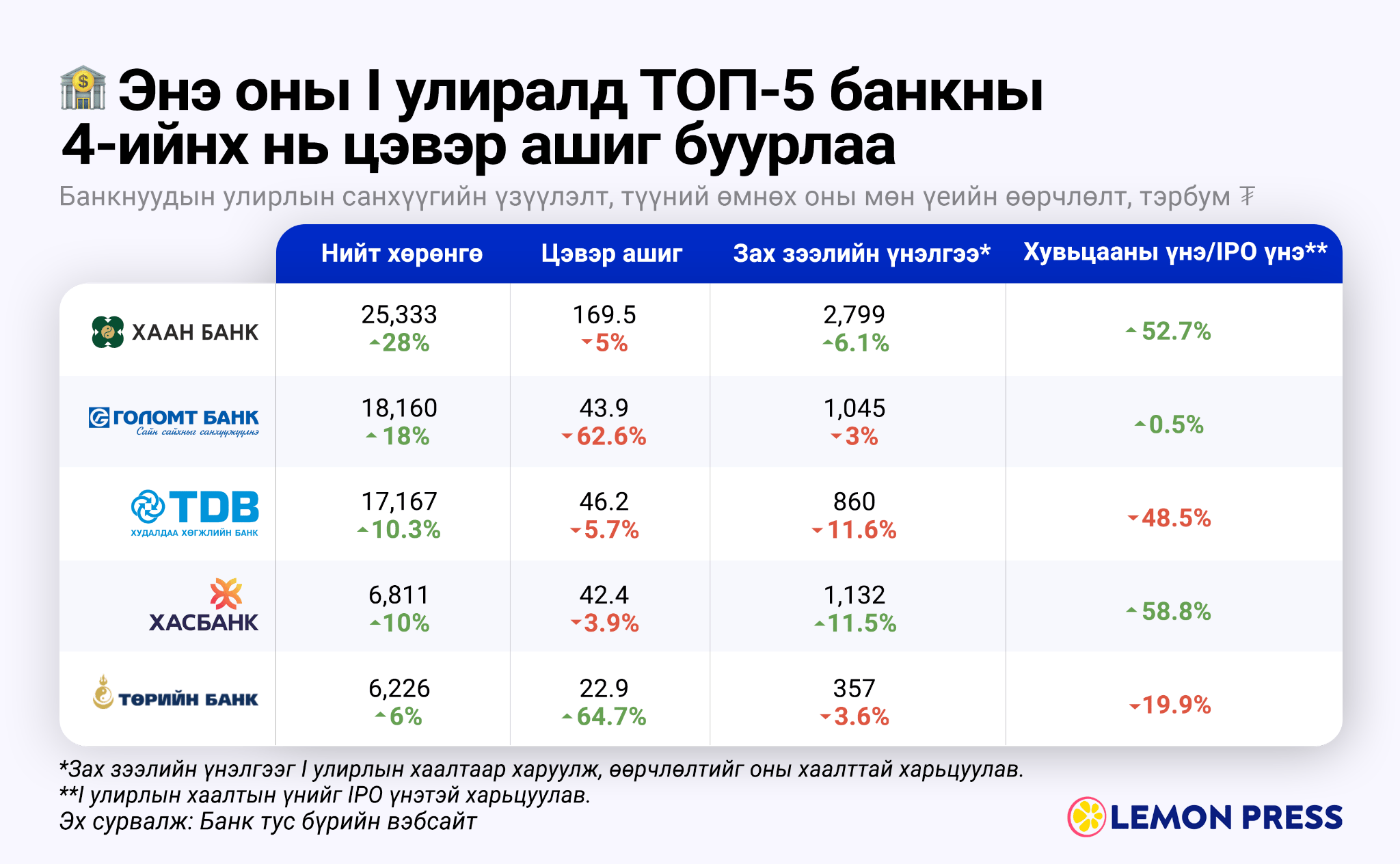 2023-2024 он банкны салбарын ашигт ажиллагаа ид тэлсэн бол одоо буураад эхэлжээ. Тодруулбал, ТОП-5 банкны 4-ийнх нь цэвэр ашиг буурч нийт дүн жилийн өмнөхөөсөө ₮78 тэрбумаар багасаж ₮325 тэрбум болов. Энэ нь санхүүжилтийн зардал, эрсдэлийн сангийн зардал болон хүүгийн зардлын өсөлтөөс үүдэлтэй.