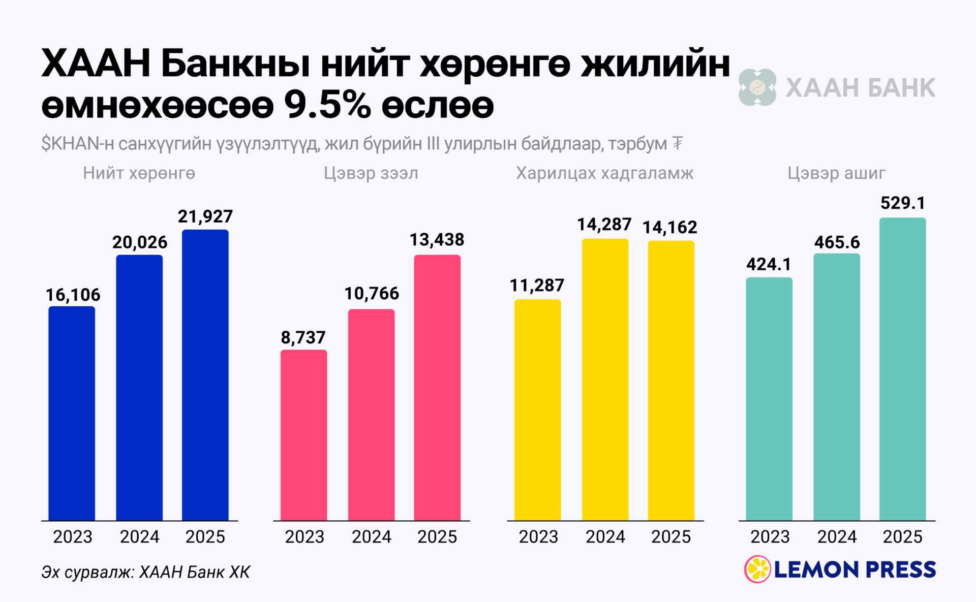 📌 Алгуураар, тогтмол өснө: Цаашлаад тус банкны нийт хөрөнгө 2024 оны III улиралд ₮20 их наядын босго давж байв. Харин энэ жилийн мөн үед 9.5% нэмэгдэж ₮21.9 их наяд болсон байна. Нийт хөрөнгийн өсөлтөд цэвэр зээлийн хэмжээ ихээхэн нөлөөтэй. Энэ утгаараа $KHAN-н цэвэр зээл жилийн өмнөхөөсөө 24.8% өсжээ.