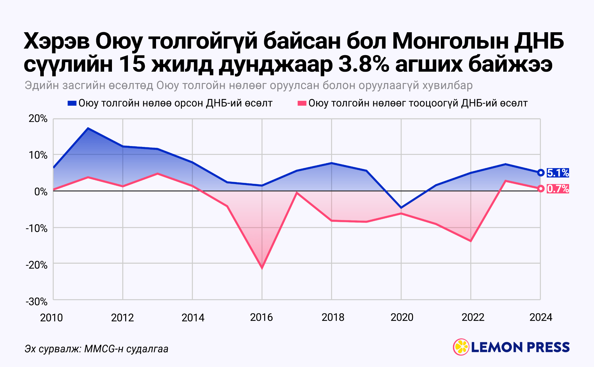 2010 оноос хойших бодит эдийн засгийн өсөлтийг харвал жилийн дундаж нь 6.2% байж. Үүнд мэдээж Оюу толгойн нөлөө буюу татсан хөрөнгө оруулалт, гаргасан экспорт, төлсөн татвар, хийсэн худалдан авалт зэрэг нь орж тооцогдсон гэсэн үг. Харин энэ бүх нөлөөг нь авч хаяад харвал тус 15 жилийн 8-д нь эдийн засаг агших байсан буюу дундаж нь -3.8% байх байсан гэсэн үр дүн гарчээ.