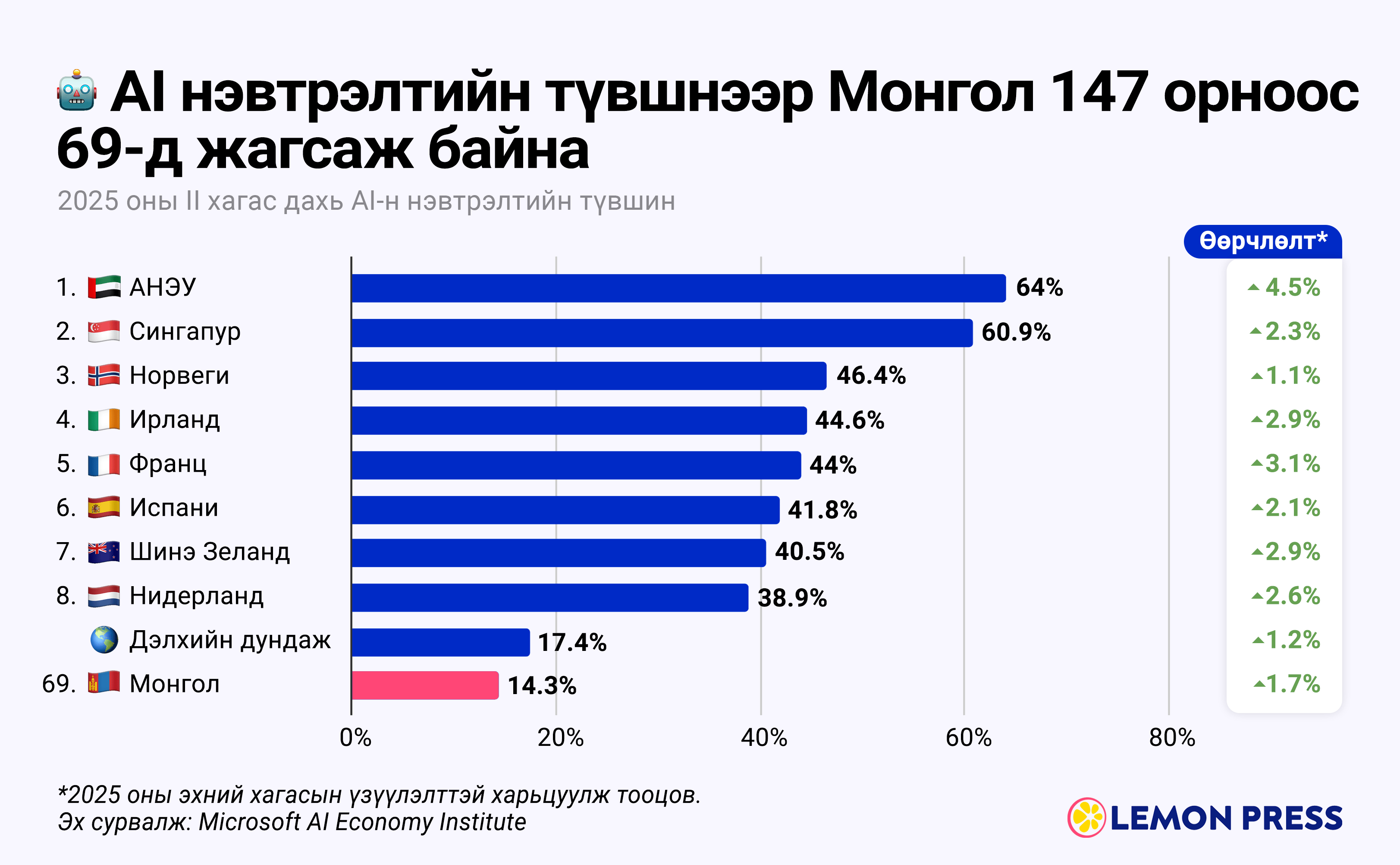 Microsoft AI Economy Institute-н судалгаагаар, 2025 оны сүүлийн хагасын байдлаар AI-г бөмбөрцгийн хүн амын 16.3% ашиглаж эхэлжээ. Энэ нь 2025 оны эхний хагасаас 1.2 нэгж хувиар өссөн үзүүлэлт аж. Судалгаанд оролцсон 147 орноос AI нэвтрэлтийн түвшнээр хүн амын 64% нь хэрэглэх болсон АНЭУ тэргүүлж байна.
