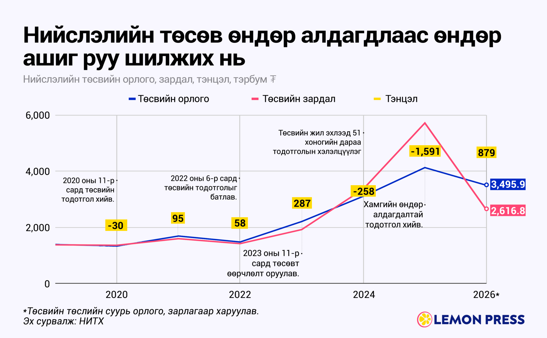Нийслэлийн 2026 оны төсвийн төсөлд суурь орлогыг ₮3.5 их наяд, суурь зарлагыг ₮2.6 их наяд байхаар тусгаж улсын төсөвт ₮263.7 тэрбумын орлогыг төвлөрүүлэх юм гэнэ. Төсөлдөө ингэж тусгасан ч цаашид салхи хаашаа ч эргэж мэднэ. Учир нь энэ оны 4-р сард нийслэлийн төсөвт тодотгол хийж алдагдлыг түүхэн дээд хэмжээнд буюу ₮1.6 их наядад хүргэсэн. Угаас нийслэлийн төсөвт жил бүр шахуу тодотгол хийж ирсэн хойно 2026 онд ч адил дүр зураг илэрхийг үгүйсгэхгүй.