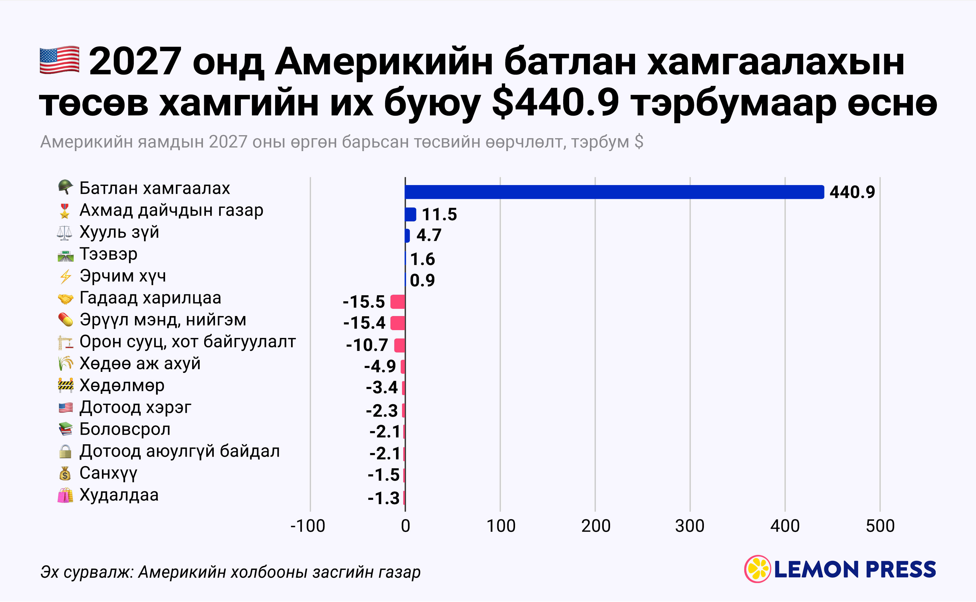 Америкийн яамнуудыг төсвөөс өсөлтөөр Батлан хамгаалах яам тэргүүлж байна. Тухайлбал, ирэх жил тус яамны төсөв өмнөх оноос ойролцоогоор $440.9 тэрбумаар өсөж $1.5 их наядад хүрэхээр тусгагджээ. Хэрэв тус төсөв батлагдвал Дэлхийн II дайнаас хойших Америкийн батлан хамгаалах яамны хамгийн өндөр төсөв болно.