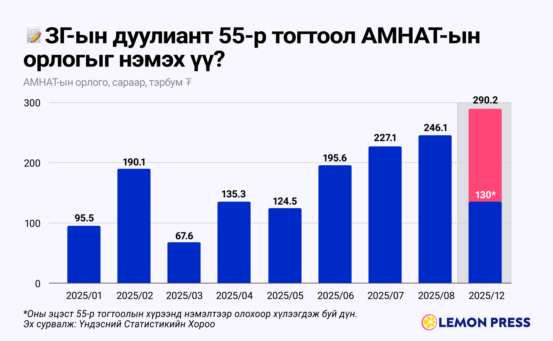 ₮1.3 их наяд: Одоо АМНАТ нэмэгдэж байна гэж яриад байгаа боловч оны эхний 8 сарын байдлаар АМНАТ-ийн орлого өнгөрсөн оны мөн үеэс 47% буурч ₮1.3 их наяд болсон бол УУББ-ээр арилжаалагдсан бүтээгдэхүүний хэмжээ 28.9% багасаж 13.1 сая тн болсон байна.